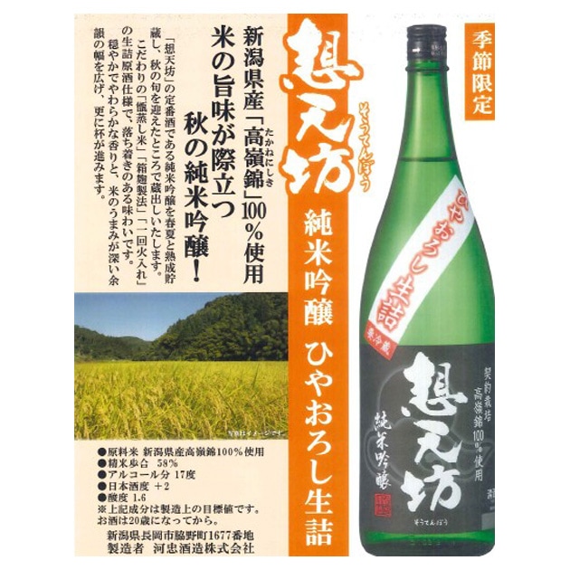「高嶺錦」を100%使用し、こだわりの製法で醸し、生詰め原酒で蔵出しする想天坊の秋の純米吟醸“ひやおろし”。米の旨味が際立ち、熟成されたふくらみのある落ち着きのある味わいです。